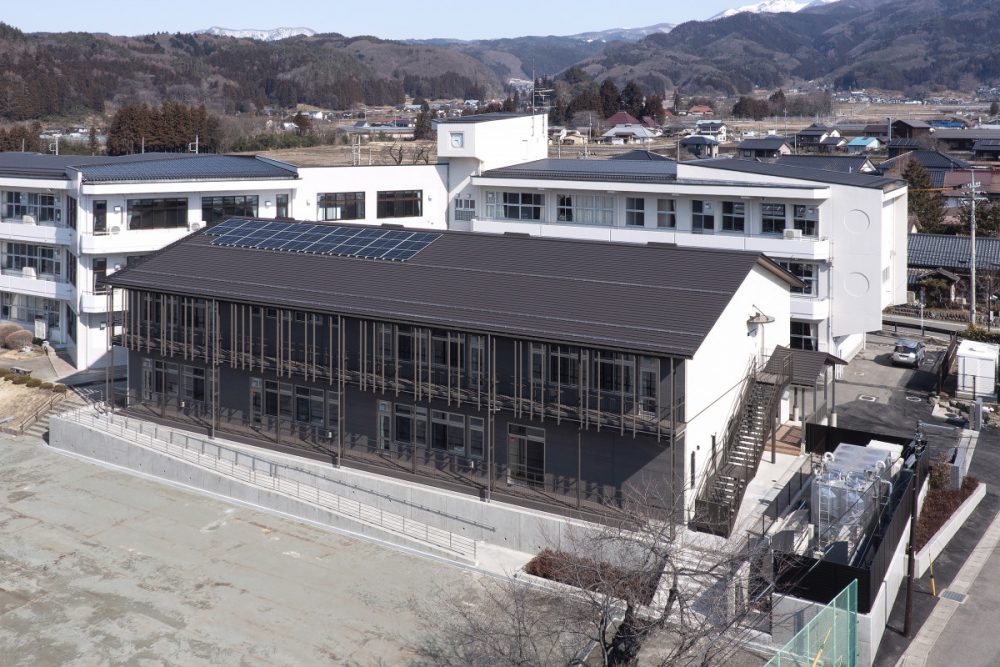 配置計画は、川場村の学校林の木材を活用した木造2階建ての新校舎と旧川場小学校校舎を別棟渡り廊下で接続しました。